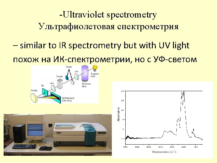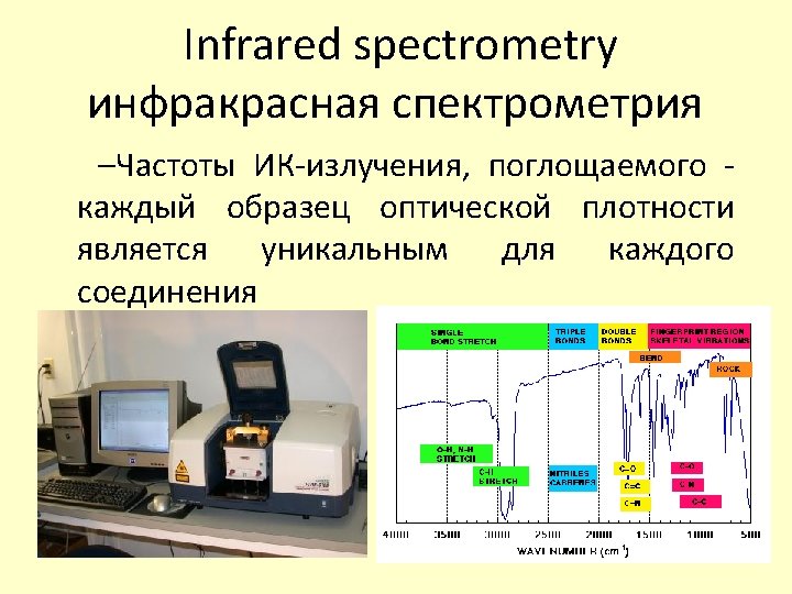 Nuclear Magnetic Resonance Spectroscopy Спектроскопия ядерного магнитного резонанса(NMR) used for organic compounds. Shows what atoms hydrogen atoms are connected to and helps find structure of the molecule by identifying – OH groups, -NH 2 groups etc.