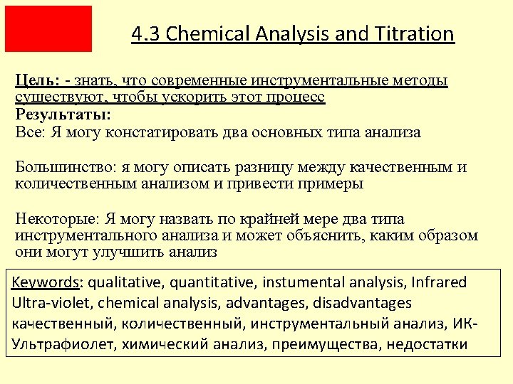 4. 3 Chemical Analysis and Titration Objective: - know that modern instrumental methods exist to speed this process Outcomes: All: I can state the two general types of analysis Most: I can describe the difference between qualitative and quantitative analysis and give examples Some: I can name at least two types of instrumental analysis and can explain how they can improve analysis Keywords: qualitative, quantitative, instrumental analysis, Infrared Ultra-violet, chemical analysis, advantages, disadvantages