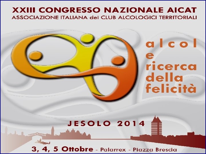 PROGRAMMA Venerdì Pomeriggio 14. 30 - 15. 00 Festa di accoglienza 15. 00 - 16. 30 Apertura organizzatori diretti: Acat , Arcat, Aicat Saluto Istituzioni 16. 30 - 17. 45 Plenaria sul tema: “Alcol e ricerca della felicità” 17. 45 - 19. 30 Sessioni tematiche su: Alcol e ricerca della felicità e … - il Club - la promozione della salute - le neuroscienze - le stagioni della vita 21. 00 Serata sociale