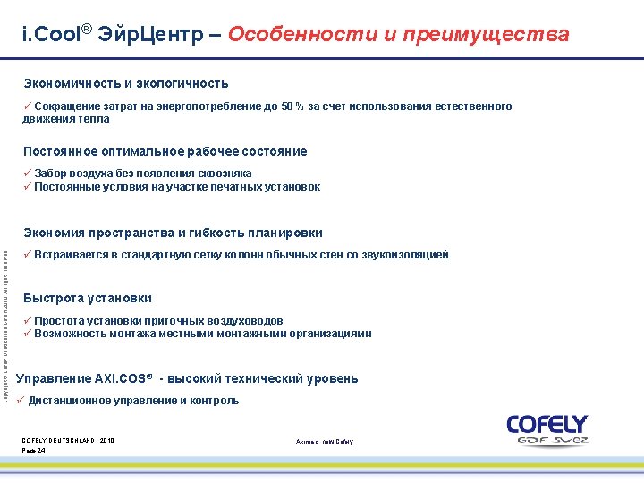 Copyright © Cofely Deutschland Gmb. H 2010. All rights reserved. i. Cool® Эйр. Центр – Естественное движение тепла 100 – 150 м³ / час за счет передвижения людей COFELY DEUTSCHLAND | 2010 Page 17 Axima is now Cofely