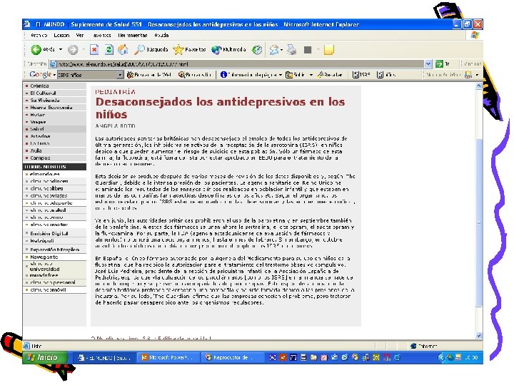 Depresión • Fluoxetina: Fluoxetina dos estudios doble ciego frente a placebo en pacientes “resistentes” (Boulos et al. , 1992; Ghaziuddin et al. , 1995) y un tercero en depresión mayor en niños y adolescentes (Emslie et al. , 1997) significativos, más un estudio de seguimiento a largo plazo (Emslie et al. , 1998) • Sertralina: Sertralina estudios doble ciego significativos (Wagner et al. , 2003) • Paroxetina: Paroxetina estudios doble ciego y abiertos significativos (Miranda et al. , 2003; Rey-Sánchez y Gutiérrez-Casares, 1997) • Citalopram: Citalopram estudios abiertos favorables
