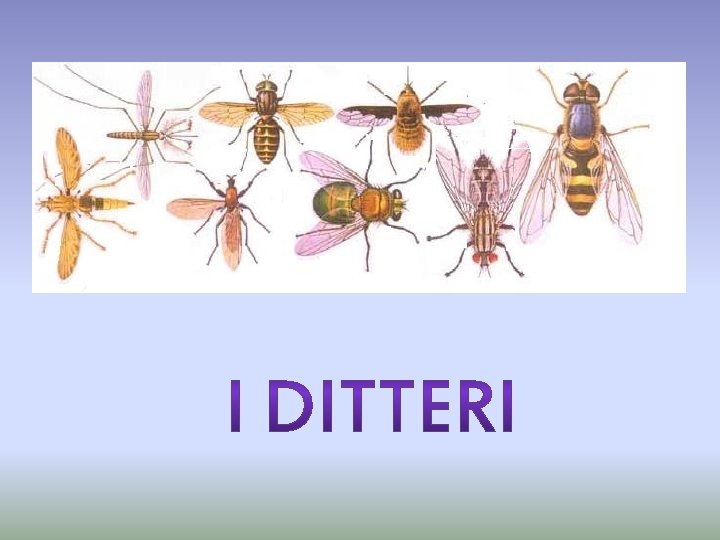 • I Ditteri costituiscono un ordine di Insetti terrestri o idrofili, frequentemente acquaioli o acquatici negli stadi preimmaginali. Sotto l'aspetto sistematico e filogenetico, i Ditteri appartengono ai Panorpoidei, la prima delle tre linee evolutive in cui si è sviluppata l'olometabolia degli Endopterigoti. • L'ordine, presente sulla Terra dal Permiano nelle sue forme più primitive, comprende circa 120. 000 specie conosciute. La notevole varietà di ambienti colonizzati e la frequente relazione con l'Uomo, con implicazioni di carattere economico, medico ed igienicosanitario, fanno di questo ordine uno dei raggruppamenti di insetti di maggiore importanza. Basti pensare che nell'ordine sono comprese specie che rientrano fra le più importanti piaghe a carico dell'agricoltura mondiale, specie responsabili della trasmissione di gravi e tristemente famose malattie a carico dell'uomo talora, come ad esempio la malaria, diffuse su più continenti, e infine specie ubiquitarie e commensali dell'uomo, come la comunissima mosca domestica.