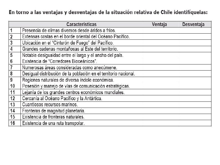 CONSECUENCIAS DE LA FORMA Y POSICIÓN RELATIVA DEL PAÍS DESVENTAJAS A. Fronteras naturales de Magnitud Planetaria: Tanto el desierto de Atacama como las altas cadenas constituyen fronteras naturales en el Norte y en el Este. En el Sur los hielos antárticos configuran una barrera en la ruta aérea transpolar; y por el oeste, la presencia del Océano Pacífico ofrece un espacio vacío de poblamiento. B. Intensa actividad sísmica y volcánica: cuyas consecuencias se manifiestan negativamente en el normal quehacer de la vida, con grandes costos humanos y materiales. C. Desfavorable disimetría entre largo y ancho, en perjuicio de una circulación más expedita entre los extremos y el centro del país. D. Desigual distribución de la población en perjuicio de los extremos. E. Comercio Exterior: Por el relativo aislamiento de nuestro país, nuestras relaciones comerciales se ven complejizadas por las distancias y los costos de transportes.