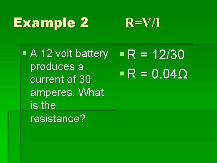 Example 2 § A 12 volt battery produces a current of 30 amperes. What is the resistance? R=V/I § R = 12/30 § R = 0. 04Ω