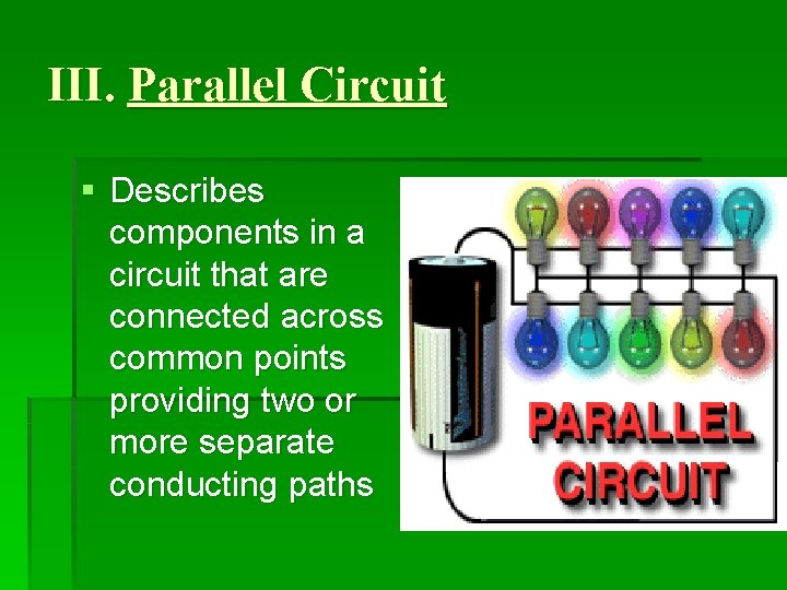 III. Parallel Circuit § Describes components in a circuit that are connected across common points providing two or more separate conducting paths