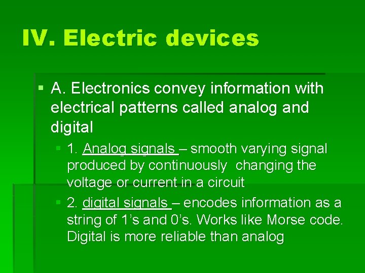 IV. Electric devices § A. Electronics convey information with electrical patterns called analog and digital § 1. Analog signals – smooth varying signal produced by continuously changing the voltage or current in a circuit § 2. digital signals – encodes information as a string of 1’s and 0’s. Works like Morse code. Digital is more reliable than analog