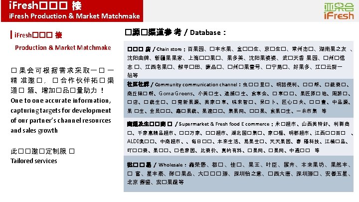 i. Fresh��� i. Fresh 接 Production & Market Matchmake ▍i. Fresh ��� 接 Service list 服�内容 Description 服 � 明 � Details ☞策划文案主� :根据�品特点及差异化��策划系列�上推 广 Copywriting: based on product characteristics and distinguishing strengths to make strong brand promotions 媒体推广 Media ☞��撰写� 文 :收集�品�料,撰写��推广文 章 Soft tweet: in line with product material to edit tweet ☞�合媒体矩�推 广 : 1、将�文投放至i. Fresh�果会公众号�条,以及几家行�自媒体平台�合投 放 2、将�文、�品九�格、�品 H 5���投放至 20+��粉�服�微信、 50+��社群 、 10+水果行�大V�行社群及朋友圈宣� Media promotion: i. Fresh platform headlines and We. Chat public accounts promotion ☞推广收集的渠道�源整合: 根据推广收集意向渠道�源,并根据�品情况�行���接 。 Promotion channel integration: sorting qualified resources to enable targeted mapping 渠道邀�及 ☞一�一精准邀�: 邀�若干家精准渠道商在�品上市�去基地��考察,�行���接。( �源� 接 One to one 渠道 商往返交通、住宿及��品的�用由主�方或相关政府根据���� ) invitation and One to one invitation: invite the qualified channel vendors to visit grower’s regions channel mapping ☞�寄�品�接渠道: ��不能去���接的渠道商,可�系采�客��寄�品,具体根据情况而定 Sample service: Directed at partially qualified channel vendors who can not visit growth regions