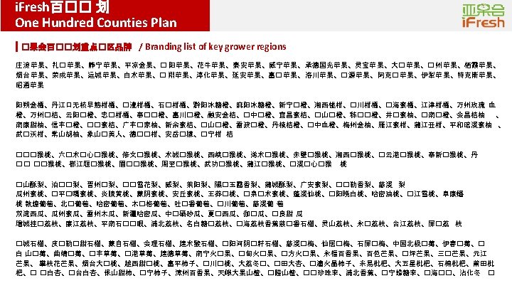 i. Fresh百�� 划 One Hundred Counties ▍i. Fresh百�� 划 One hundred counties plan i. Fresh�果会提出的深度服�国内重点果品�区的落地�划, �持 “全球�源深化落地�区 ”�略,���果会服�的 重 心下移和�源下沉 。 “Go to earth” service strategy in line with Global resources taken to grower regions for the purpose of shifting the center of gravity and service resource 根据百�果品的�展需求,将�源精准�入到相�的�区, 帮助� 区在品种� 化、种植技� 革新、品牌打造、渠道拓 展 等方面得到�一步提升 ! Identify the development needs of the counties, optimize the resources required, innovate planting technology, brand building and channel development with other county needs ▍�果会�源 � Resource database 1、采�商� Procurement 2、先�技�菜� (保�、冷�物流、包装分 �、精深加 等) Cutting edge technology menu (fresh keeping, cold chain logistics, packing & sorting, refine – process) 3、�家� (国家��家、首席科学家、�位 � 家、国外�家、品牌�家等) Experts (national level, Chief, Foreign Brand…) 4、区域品牌�略�划��机构 Regional brand promotion institution 5、招商引�主体 Investment promotion institution 6、品牌推广��机构 Brand promotion institution 7、社交新零售、�子商�等��平台 New social model retail, E- commerce 8、���村金融服� Rural finance institution