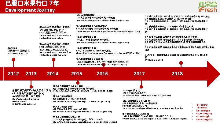 i. Fresh�果会平台� 介 Introduction i. Fresh�果会成立于 2012年,致力于搭建�洲�先的果蔬��信息和市�推广平台。 Founded in 2012, i. Fresh is committed to building a leading information and marketing platform for the fruit and vegetable industry in Asia. 作� � 洲� 先的果蔬行� 服� 平台,i. Fresh� 果会� 注服� 于全球果蔬� � ,集媒体推广、展� 展示、高峰� � 、 � � � 接、科技� 作、技� 交流� 一体,� 果蔬� � 提供一站式� 合服� 。i. Fresh� 果会目前已� 和� 西、云南、 海南、广 西、新疆、四川、�宁、山�等重点水果�区��企�及政府建立了�密的�略合作关系。 As Asia’s leading fruit and vegetable industry platform, i. Fresh focuses on serving the global fruit and vegetable industry by integrating media promotion, exhibition, summit forums, production and marketing docks, scientific and technological cooperation, technical exchange providing one-stop service for global customers. i. Fresh has established strategic cooperation with Yunnan, Hainan, Guangxi, Xinjiang, Sichuan, Liaoning and Shandong governments. In addition, i. Fresh has identified and established relationships with local leading enterprises in key grow regions. 其中,i. Fresh� 洲果蔬� � 博� 会是中国� 先的水果� � 易盛会,迄今已成功� � 十一届。已累� 向 1564350位 全球 � � � 众展示果品;累� 服� � 4281家海内外展商;超� 17403种� � 果品和� 新技� 通� i. Fresh� 果会平台展 示;累� 服��澳大利�、泰国、�来西�、厄瓜多�、秘�等来自 50个国家或地区的海外客�。 i. Fresh Asia Fruit and Vegetable Industry Expo has been the leading fruit industry trade fair in China, accumulating 11 years of successful experience. It has shown products to over 1. 5 million professional audiences, provided service for over 4, 200 exhibitors, displayed 17, 403 kinds of high quality fruits and demonstrated cutting edge technology in doing so. In addition to domestic customers, there also 50 overseas countries represented including Australia, Thailand, Malaysia, Ecuador, Peru…