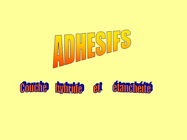 Propriétés d ’un adhésif • • • Être actif d ’emblée Être actif en faible épaisseur Adhésion aux structures dentaires : émail + dentine Adhésion aux composites Cohésion Répartition uniforme Polymériser en présence d ’oxygène Coller en milieu humide à l ’émail et à la dentine Pérennité du collage