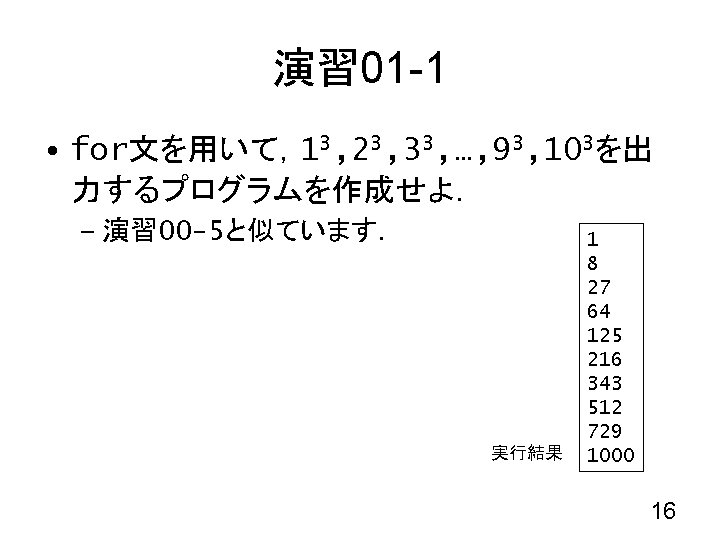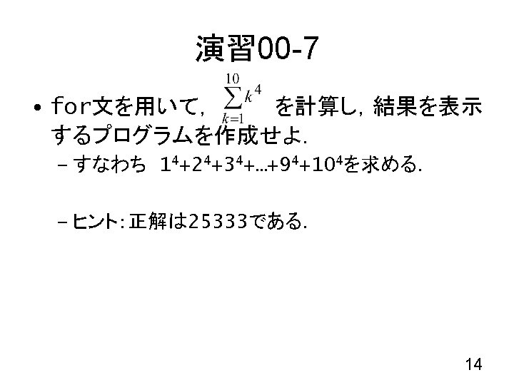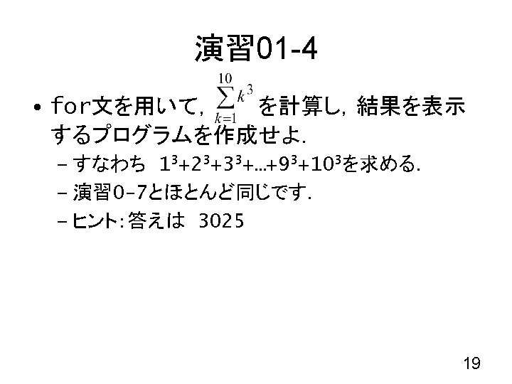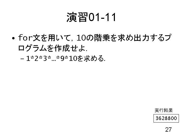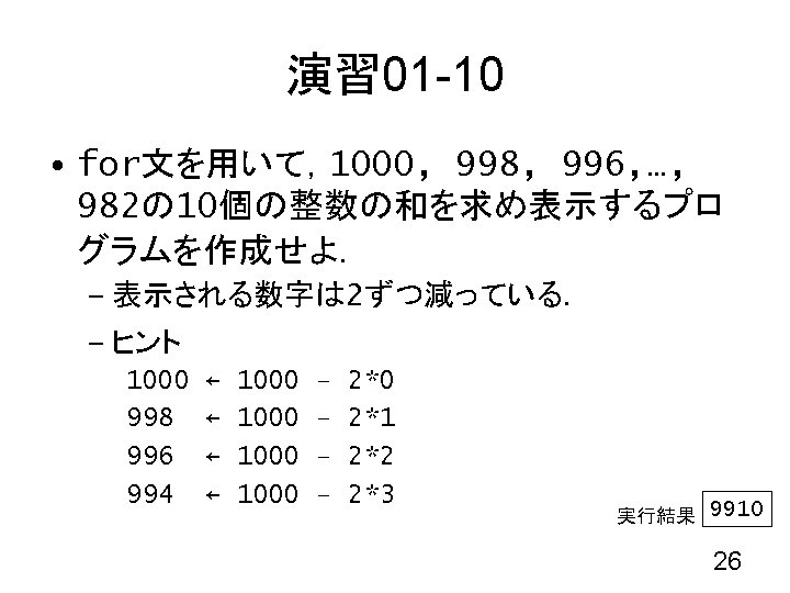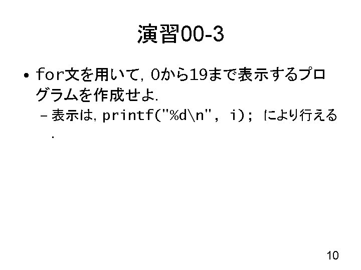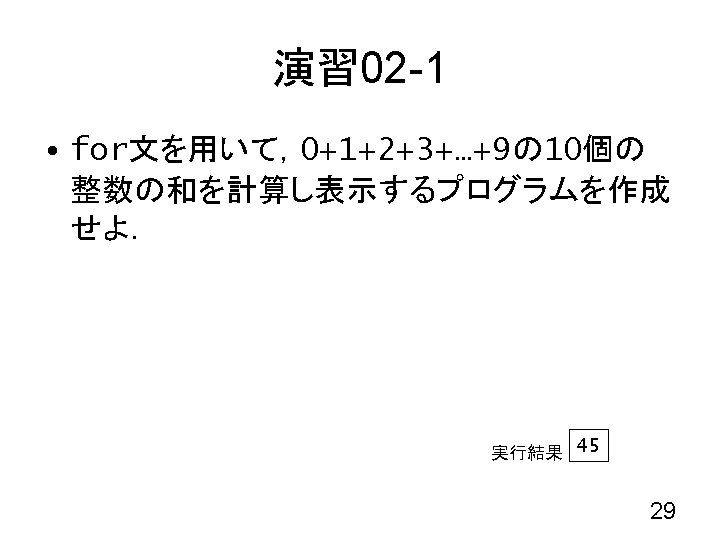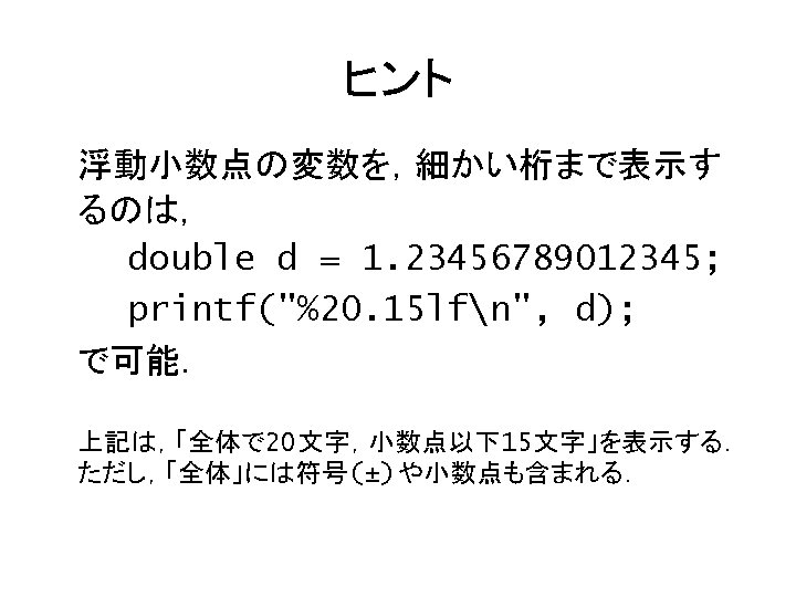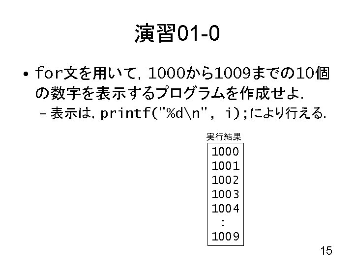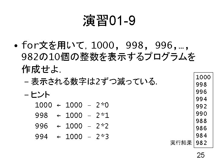 演習 01 -8 • for文を用いて,500. 0, 500. 3, 500. 6, …, 502. 7の 10個の実数と,その 合計を表示するプログラムを作成せよ. 500. 000000 – 表示される数字は 0. 3ずつ 増えている. – 浮動小数点の表示は以下で可能 double d; printf("%lfn", d); 500. 300000 500. 600000 500. 900000 501. 200000 501. 500000 501. 800000 502. 100000 502. 400000 502. 700000 実行結果 合計=5013. 500000 24