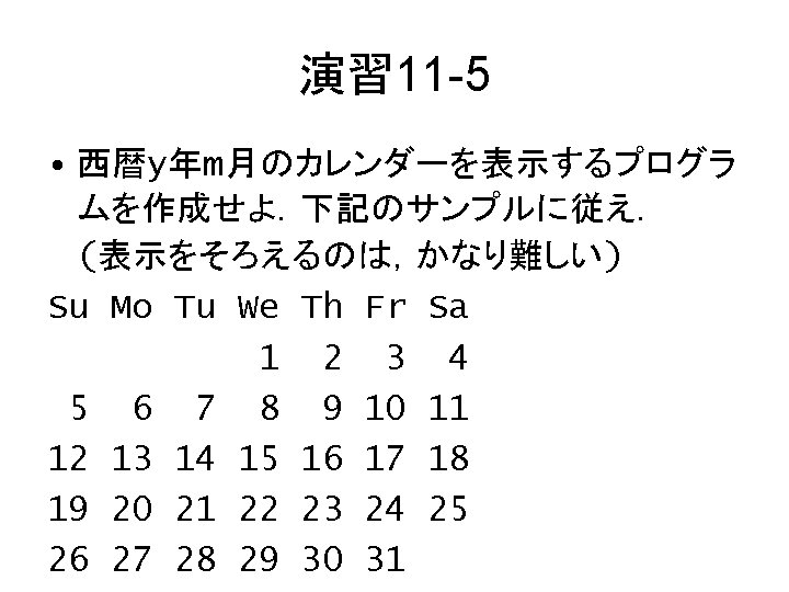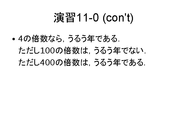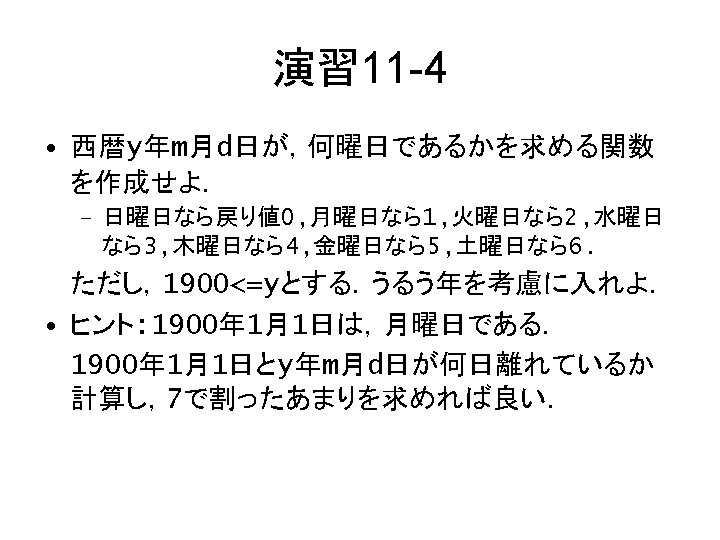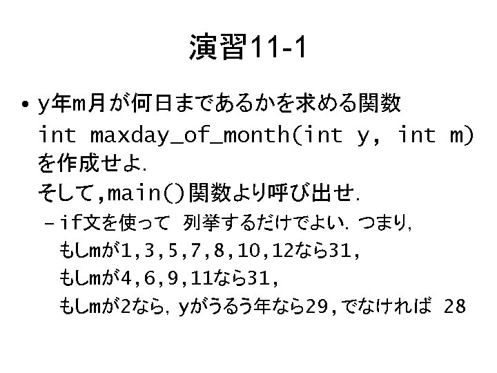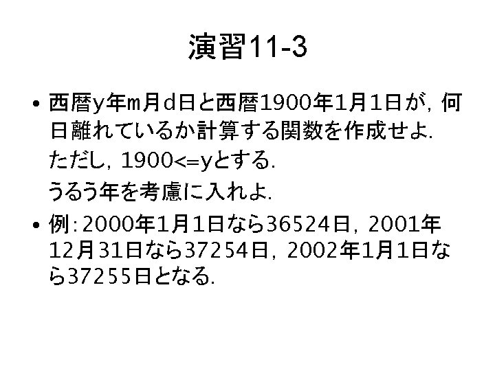 演習 11 -2 • 西暦y年m月d日と西暦y年 1月1日が,何日離 れているか計算する関数 int days_from(int y, int m, int d) を作成せよ. – 例: days_from(2112, 1, 1)は 0 – day_from(2112, 1, 2)は 1 – day_from(2112, 3, 4)は 63 – day_from(2112, 9, 3)は 246