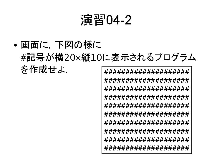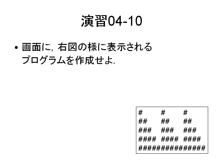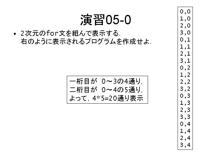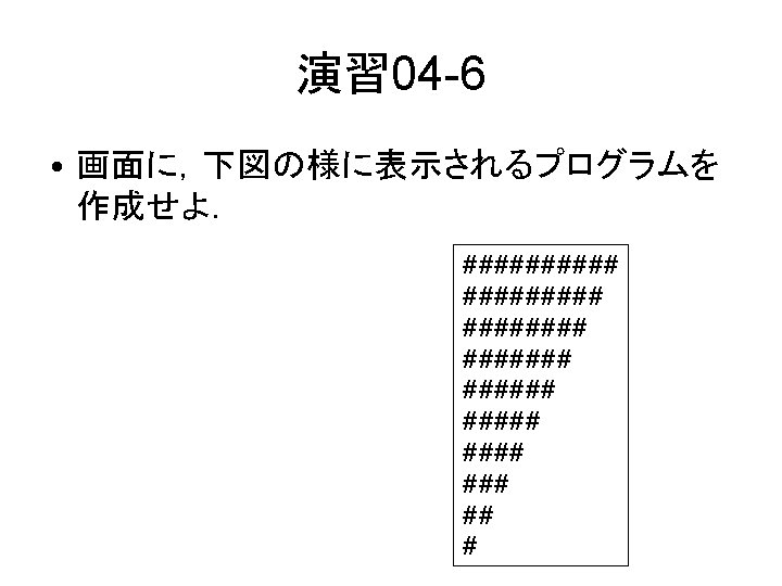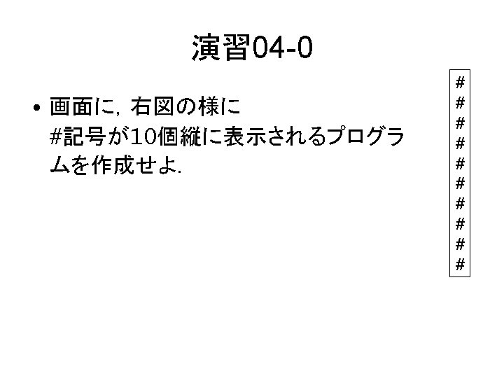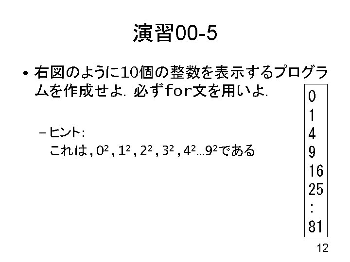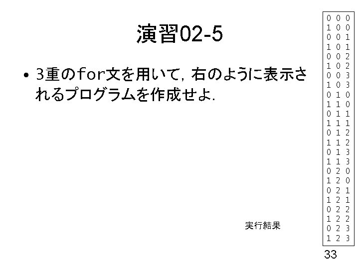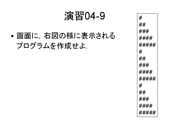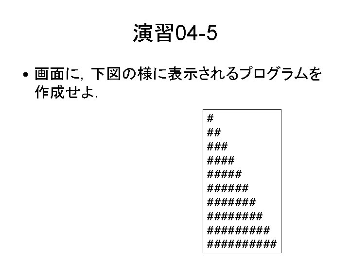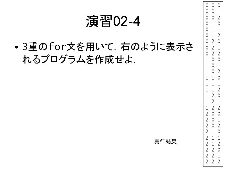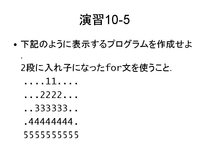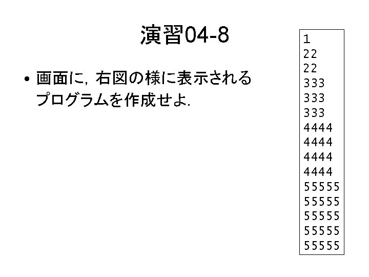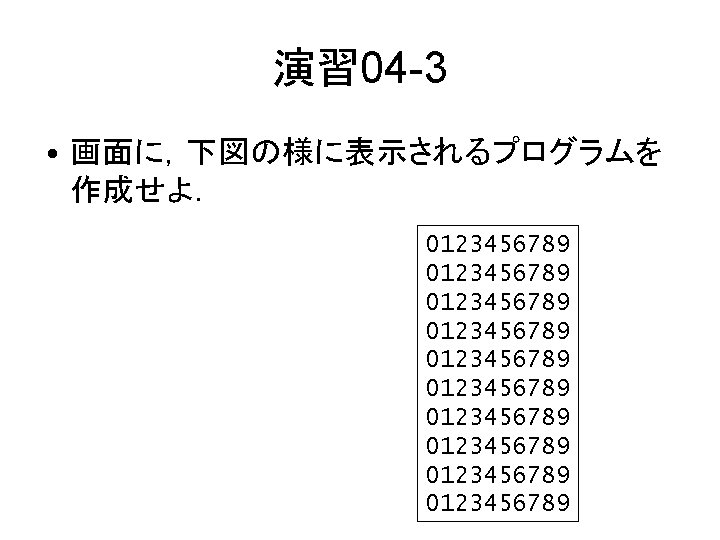 演習 04 -4 • 画面に,下図の様に表示されるプログラムを 作成せよ. 00000 11111 22222 33333 44444 55555 66666 77777 88888 99999