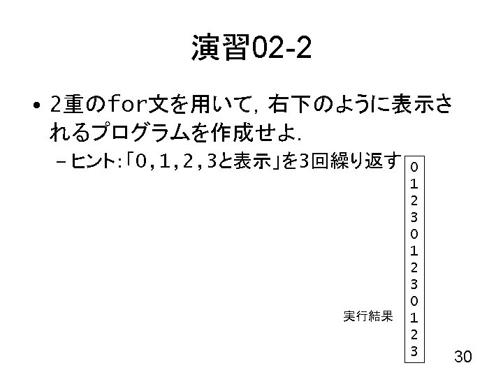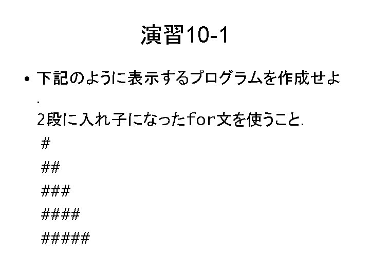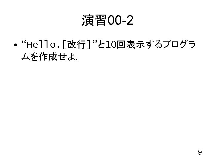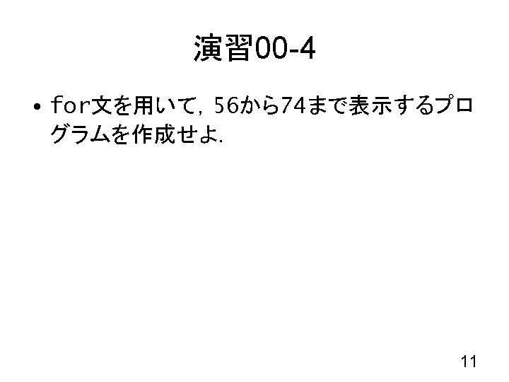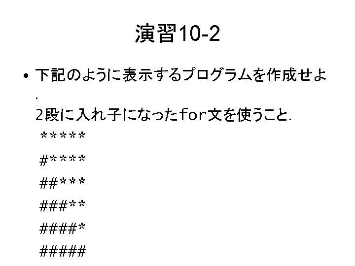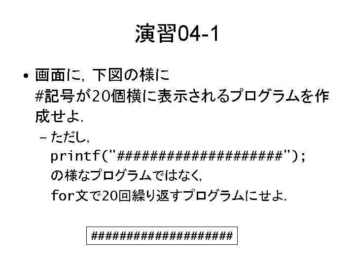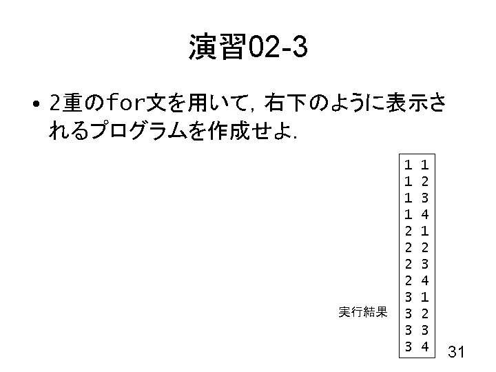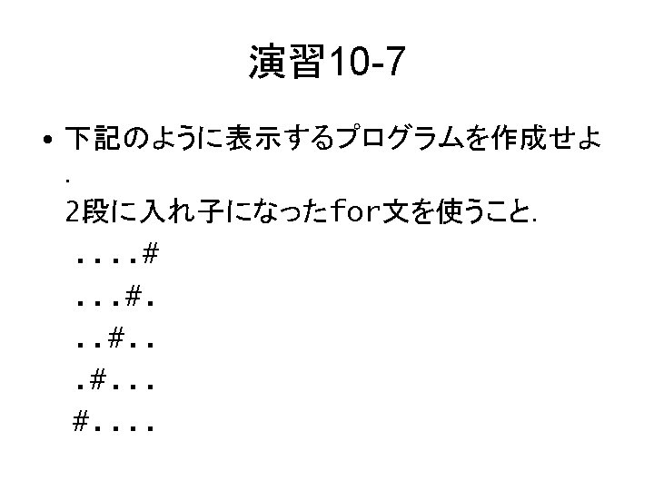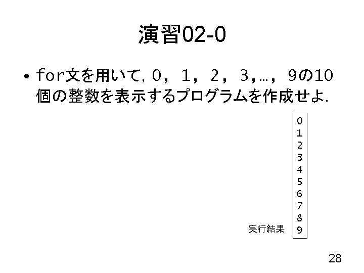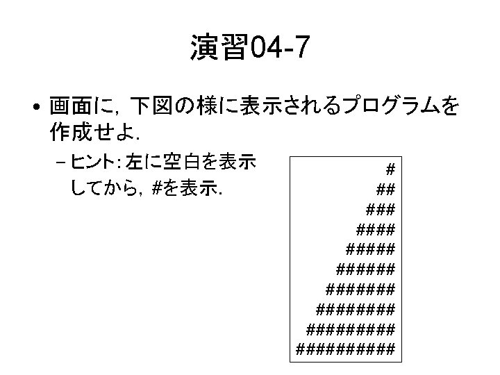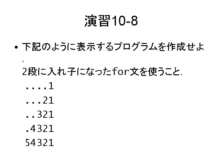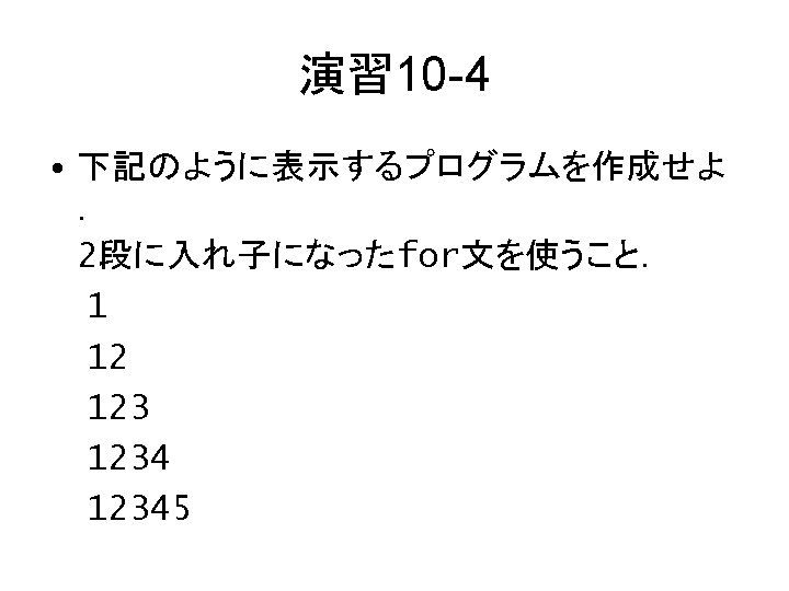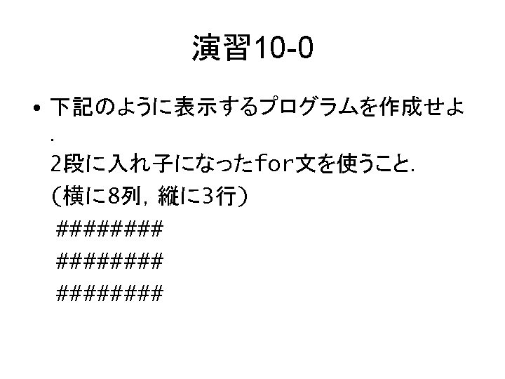 演習 04 -4 • 画面に,下図の様に表示されるプログラムを 作成せよ. 00000 11111 22222 33333 44444 55555 66666 77777 88888 99999