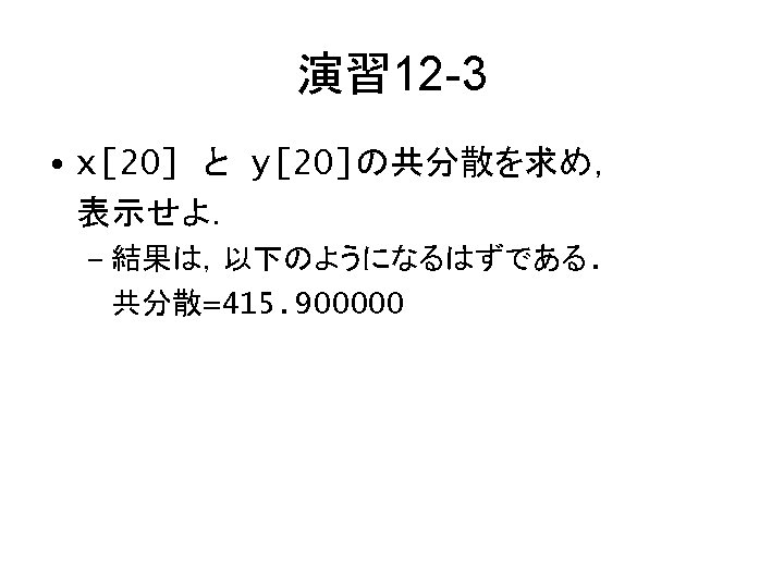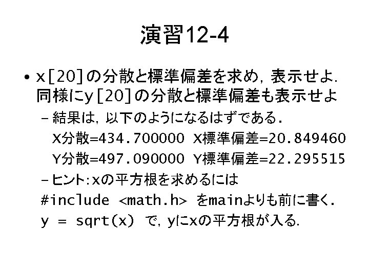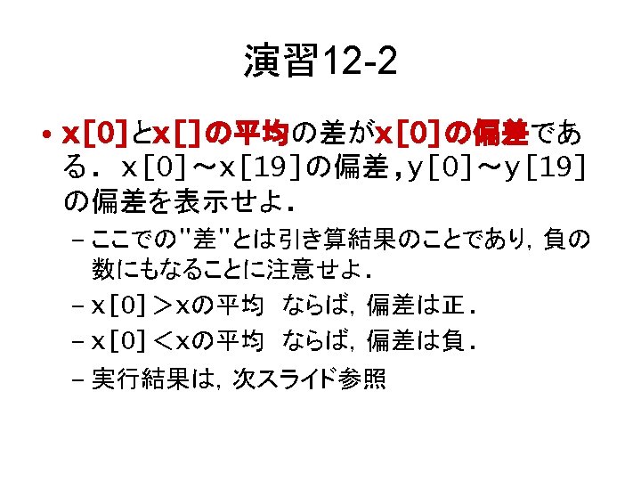![演習 12 -2の実行結果 x[0]の偏差=-9. 000000 x[1]の偏差=34. 000000 x[2]の偏差=9. 000000 x[3]の偏差=11. 000000 x[4]の偏差=-33. 000000 x[5]の偏差=28. 演習 12 -2の実行結果 x[0]の偏差=-9. 000000 x[1]の偏差=34. 000000 x[2]の偏差=9. 000000 x[3]の偏差=11. 000000 x[4]の偏差=-33. 000000 x[5]の偏差=28.](https://slidetodoc.com/presentation_image_h2/d6c05dbe132fe0cd73a48278a21e07c1/image-112.jpg)