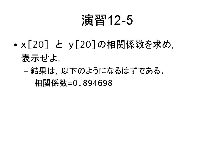 演習 12 -0の実行結果 x[0] = 49 x[1] = 92 x[2] = 67 x[3] = 69 x[4] = 25 x[5] = 86 x[6] = 29 x[7] = 64 x[8] = 91 x[9] = 37 x[10] = 53 x[11] = 53 x[12] = 53 x[13] = 29 x[14] = 53 x[15] = 61 x[16] = 86 x[17] = 79 x[18] = 54 x[19] = 30 y[0] = 31 y[1] = 93 y[2] = 59 y[3] = 69 y[4] = 24 y[5] = 77 y[6] = 22 y[7] = 75 y[8] = 75 y[9] = 26 y[10] = 57 y[11] = 46 y[12] = 54 y[13] = 48 y[14] = 53 y[15] = 60 y[16] = 70 y[17] = 90 y[18] = 39 y[19] = 14