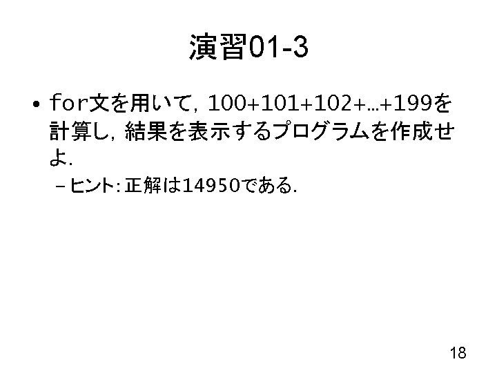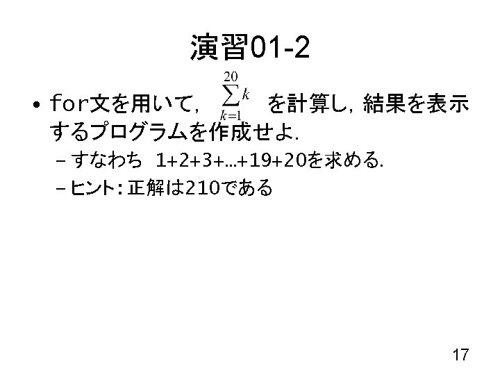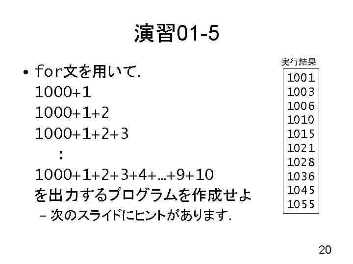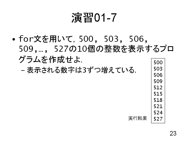 演習 01 -6 1000, 1001, 1002, 1003, 1004, 1005, 1006, 1007, 1008, – つまり1000+1001+1002+…+1019 1009, 1010, を計算する. 1011, 1012, 1013, 1014, 1015, 1016, 1017, 1018, 実行結果 1019, • for文を用いて,1000から1019ま での 20個の数字の合計を表示す るプログラムを作成せよ. • 途中経過も表示せよ. 1000 2001 3003 4006 5010 6015 7021 8028 9036 10045 11055 12066 13078 14091 15105 16120 17136 18153 19171 22 20190
