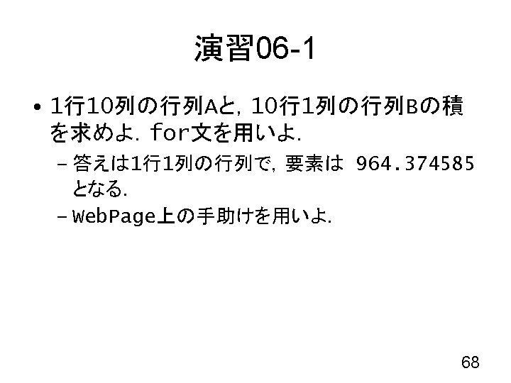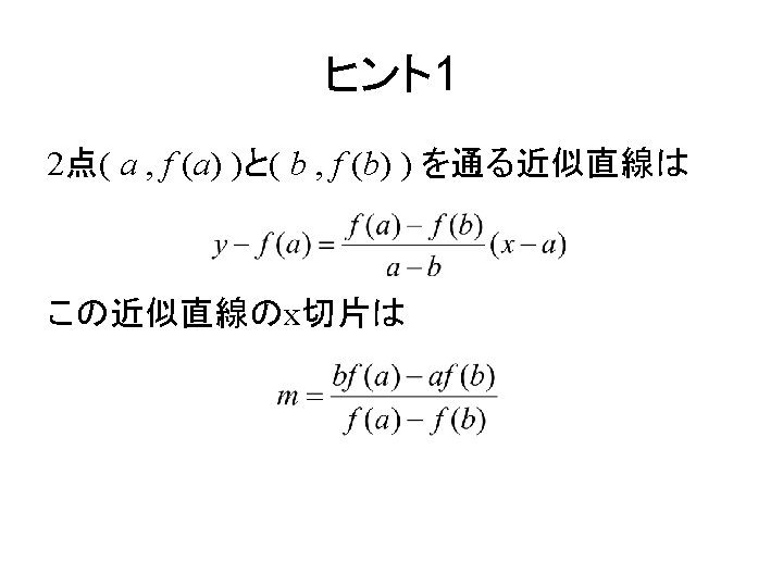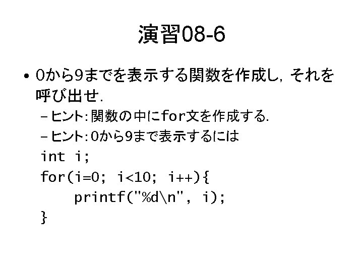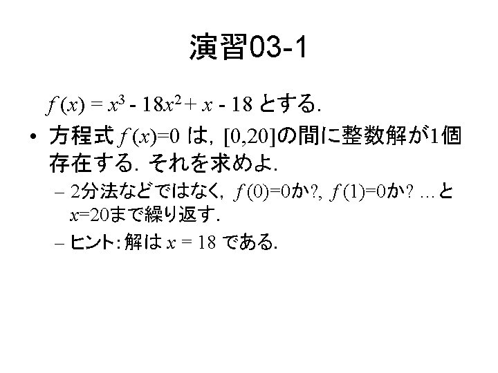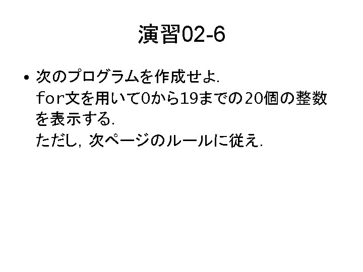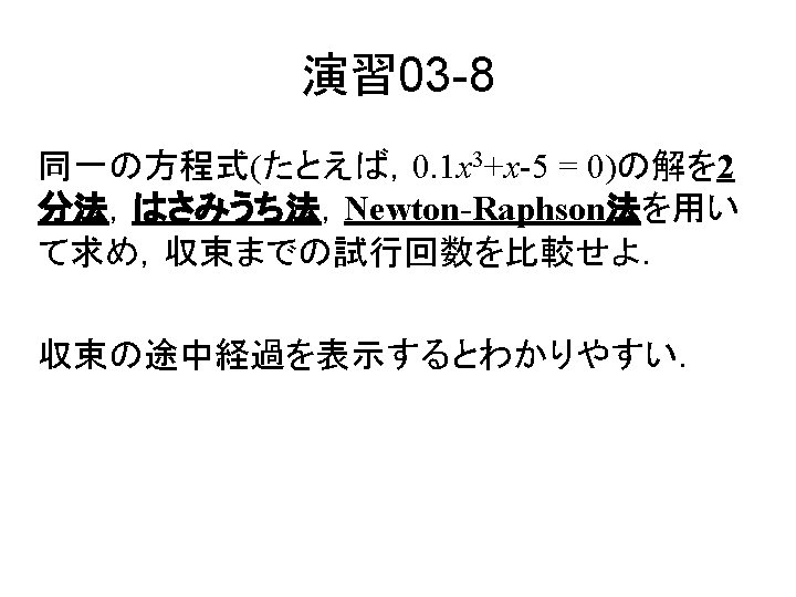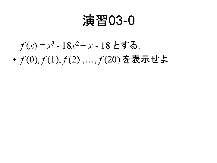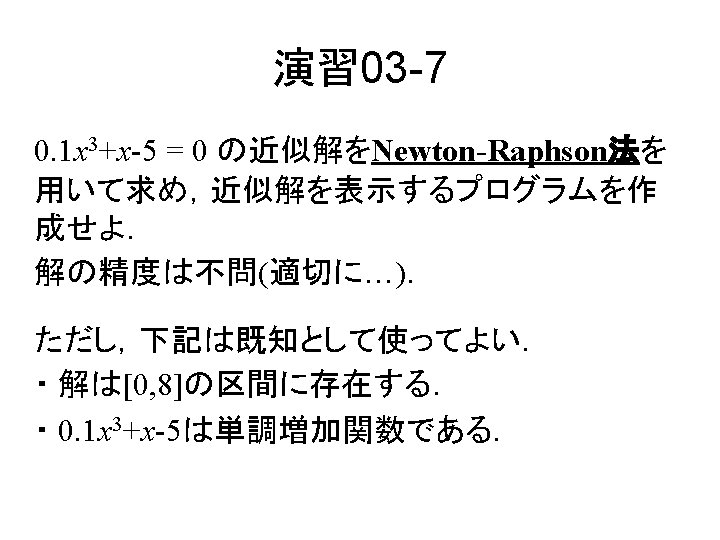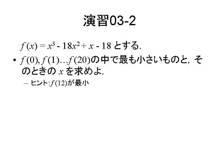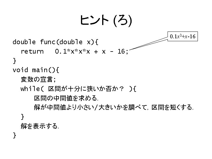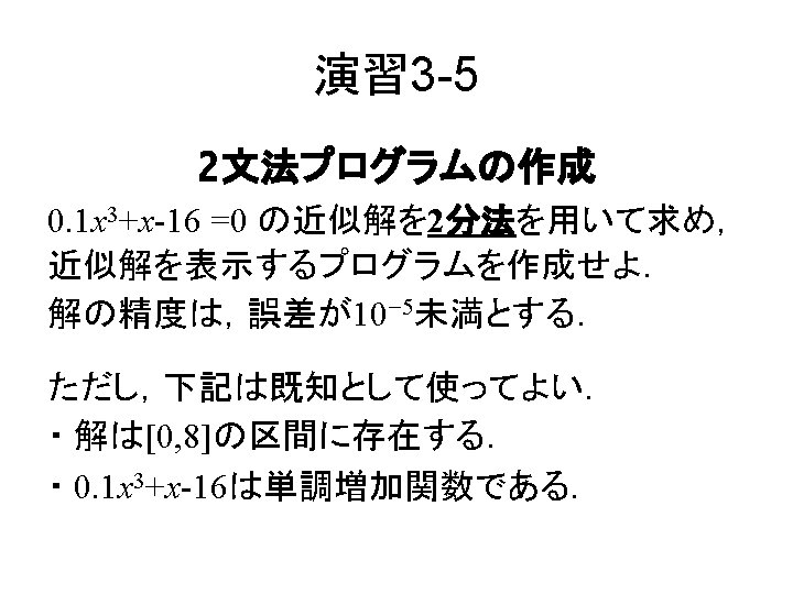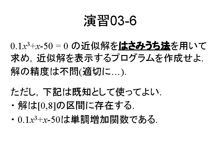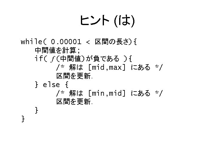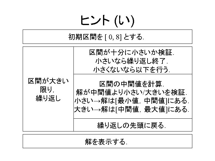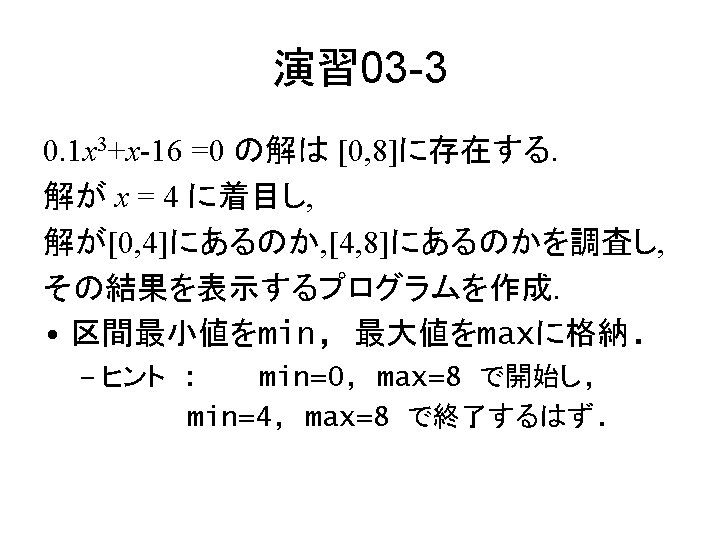 演習 03 -4 演習 4 -3の処理を 1回行うと, min と max が [0, 8] → [4, 8] と更新される. 同じ処理を 2回 [4, 8] → [4, 6] となる. 実行結果の例 この処理を for文を ans : from 0. 0000 to 8. 0000 ans : from 4. 0000 to 8. 0000 用いて 10回行う ans : from 4. 0000 to 6. 0000 ans : from 4. 0000 to 5. 0000 プログラムを作成せよ. ans : from 4. 50000000 to 5. 0000 次スライドにヒント ans : from ans : from 4. 75000000 to 4. 81250000 to 5. 0000 4. 87500000 4. 84375000 4. 82812500 4. 82031250