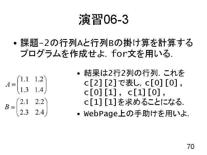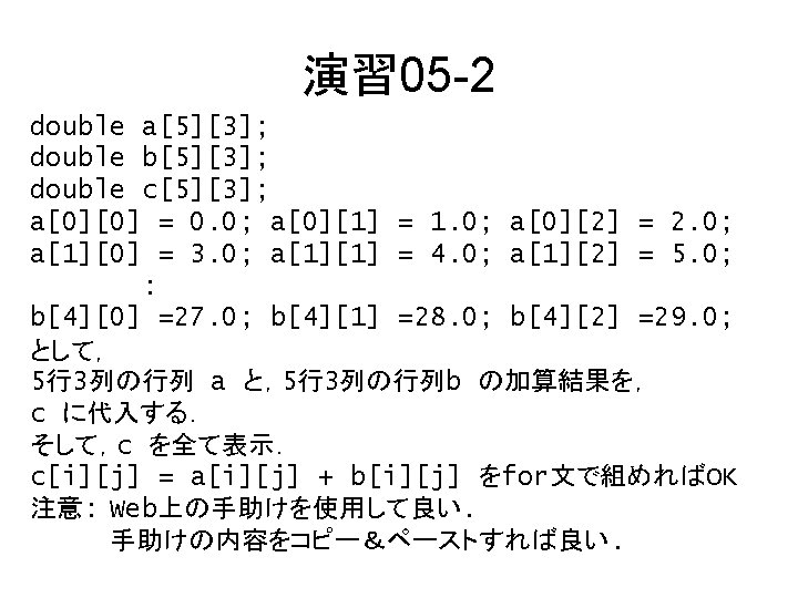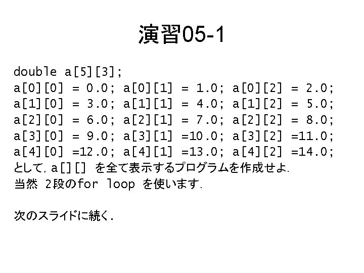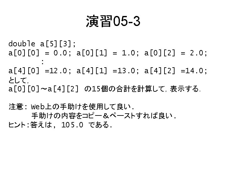 演習 05 -1 (con't) 実行結果は右のようにせよ. 注意: Web上の手助けを 使用して良い. 手助けの内容を コピー&ペーストすれば良い. double型は printf(“%lf”, d) で表示可能. a[0][0] a[0][1] a[0][2] a[1][0] a[1][1] a[1][2] a[2][0] a[2][1] a[2][2] a[3][0] a[3][1] a[3][2] a[4][0] a[4][1] a[4][2] = = = = 0. 000000 1. 000000 2. 000000 3. 000000 4. 000000 5. 000000 6. 000000 7. 000000 8. 000000 9. 000000 10. 000000 11. 000000 12. 000000 13. 000000 14. 000000