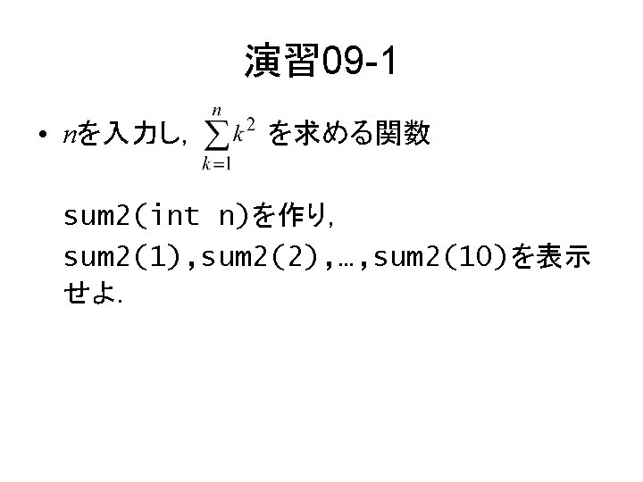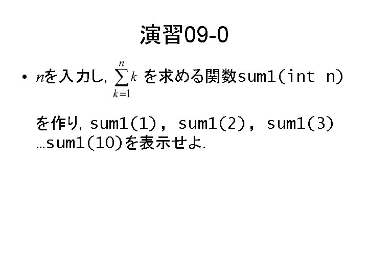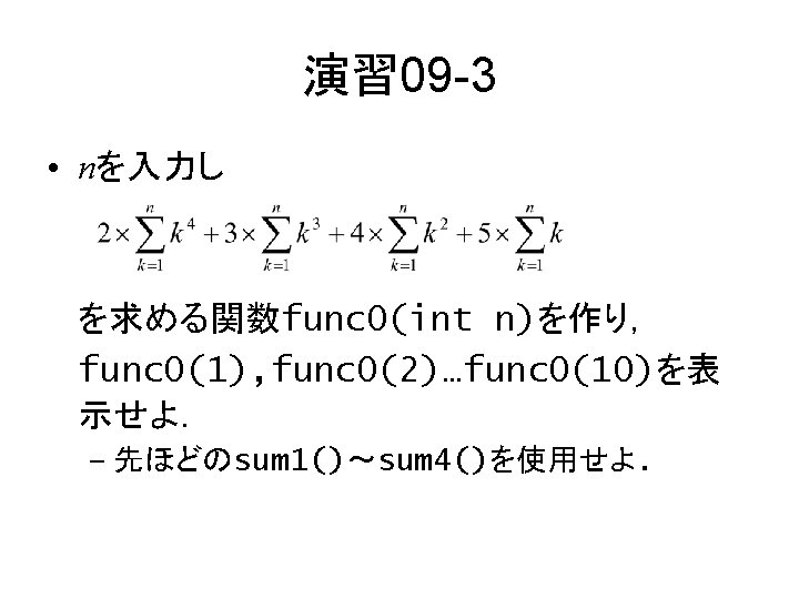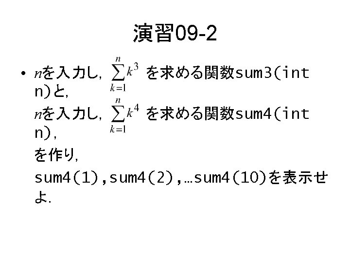 演習 09 -0 ~ 09 -3 の解答 n= 1, n= 2, n= 3, n= 4, n= 5, n= 6, n= 7, n= 8, n= 9, n=10, sum 1(n)= 1, sum 1(n)= 3, sum 1(n)= 6, sum 1(n)=10, sum 1(n)=15, sum 1(n)=21, sum 1(n)=28, sum 1(n)=36, sum 1(n)=45, sum 1(n)=55, sum 2(n)= 1, sum 2(n)= 5, sum 2(n)= 14, sum 2(n)= 30, sum 2(n)= 55, sum 2(n)= 91, sum 2(n)=140, sum 2(n)=204, sum 2(n)=285, sum 2(n)=385, sum 3(n)= 1, sum 3(n)= 9, sum 3(n)= 36, sum 3(n)= 100, sum 3(n)= 225, sum 3(n)= 441, sum 3(n)= 784, sum 3(n)=1296, sum 3(n)=2025, sum 3(n)=3025, sum 4(n)= 1, sum 4(n)= 17, sum 4(n)= 98, sum 4(n)= 354, sum 4(n)= 979, sum 4(n)= 2275, sum 4(n)= 4676, sum 4(n)= 8772, sum 4(n)=15333, sum 4(n)=25333, func 0(n)= 14 func 0(n)= 96 func 0(n)= 390 func 0(n)= 1178 func 0(n)= 2928 func 0(n)= 6342 func 0(n)=12404 func 0(n)=22428 func 0(n)=38106 func 0(n)=61556