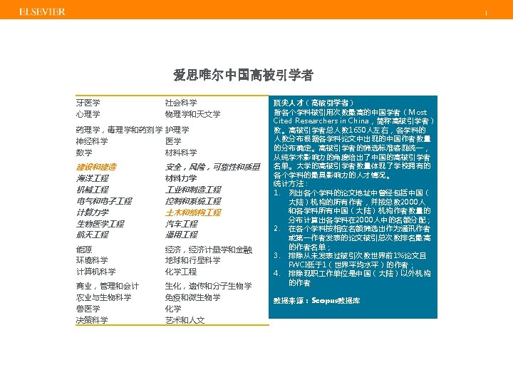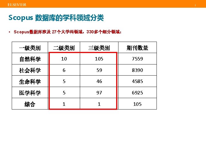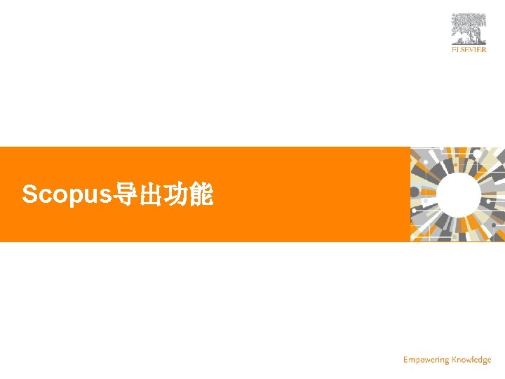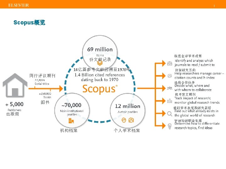 | Scopus内容范围 Physical Sciences 7, 456 Health Sciences 6, 834 Social Sciences 8, 042 Life Sciences 4, 509 BOOKS >558 book series - 30 K Volumes - 1. 2 M items JOURNALS CONFERENCES 22, 245 peer-reviewed journals >320 trade journals 97 K events 7. 7 M records >10% • Full metadata, abstracts and cited references back to 1970 • Funding data from acknowledgements • 3, 476 fully Open Access titles • Going back to 1823 Special issue of regular 138, 000 books journal & conference monographs, edited volumes, major proceedings. Mainly Engineering and Physical Sciences Update Daily Source: Scopus title list (November 2014) reference works and graduate level textbooks Focus on Social Sciences and A&H PATENTS 38 M patents from 5 major patent offices: • UK • US • Japan • Europe • World