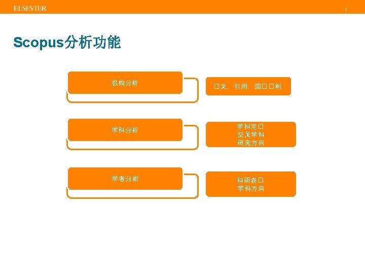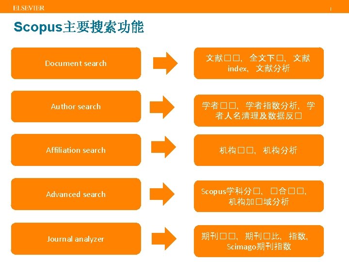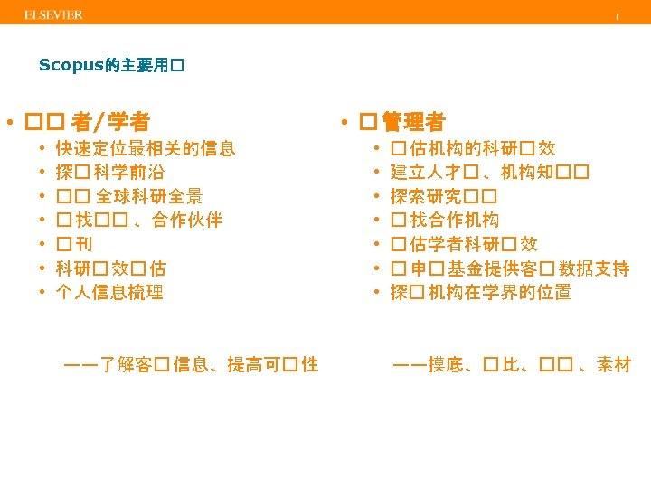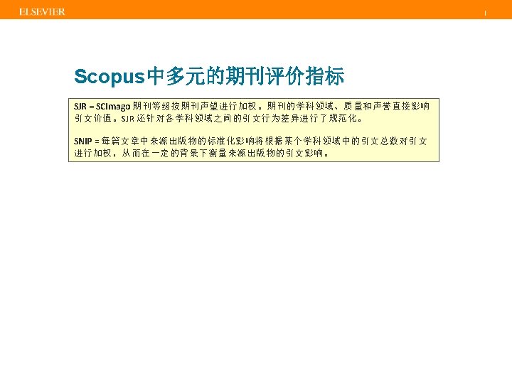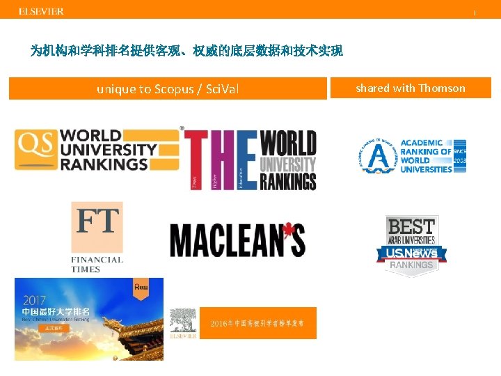 | 内容选择委员会(CSAB) • • Titles are selected by the independent Content Selection & Advisory Board (CSAB) The CSAB is chosen for their expertise in specific subject areas; many will have previously been (Elsevier) Editors Focus on quality through content selection by the independent CSAB, because: • • Provide accurate and relevant search results for users No dilution of search results by irrelevant or low quality content Support that Scopus is recognized as authoritative Support confidence that Scopus “reflects the truth”