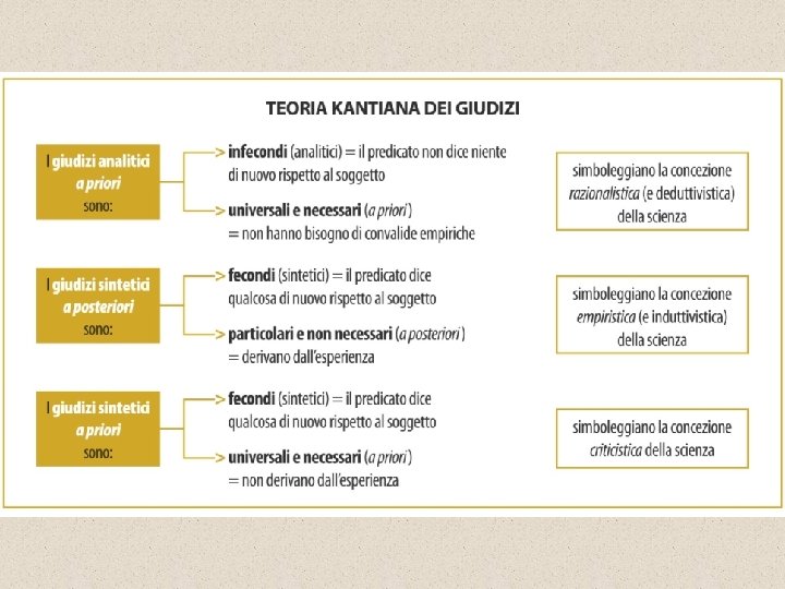 Il giudizio sintetico a priori Dunque: né il giudizio analitico (razionalismo) né quello sintetico a posteriori (empirismo) soddisfano i requisiti della conoscenza scientifica. Il giudizio analitico, infatti, è universale e necessario, ma può solo chiarire ciò che è già conosciuto, non produce nuove conoscenze; il giudizio sintetico, d'altro lato, è estensivo del sapere, ma è privo di necessità. La conoscenza deve invece essere sintetica, cioè comprensiva di elementi empirici, e razionalmente fondata: la forma del giudizio che la caratterizza è allora quella del giudizio sintetico a priori, in cui il predicato non è già compreso nel concetto del soggetto, e tuttavia è collegato a esso in modo universale e necessario.