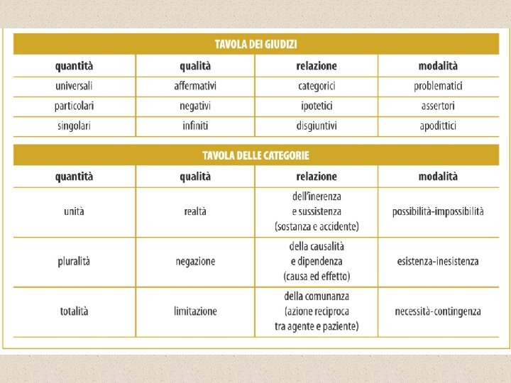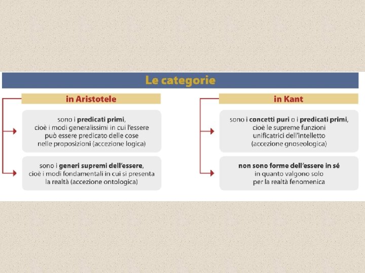 Le Categorie I concetti puri si identificano con le categorie, cioè con quei concetti basilari della mente che rappresentano le supreme funzioni unificatrici dell'intelletto. Tuttavia, a differenza delle categorie aristoteliche, che hanno un valore ontologico e gnoseologico al tempo stesso, essendo simultaneamente forme dell'essere e del pensiero, le categorie kantiane hanno una portata esclusivamente gnoseologico-trascendentale, in quanto rappresentano dei modi di funzionamento dell'intelletto, che non valgono per la cosa in sé, ma solo per il fenomeno. Schematicamente: