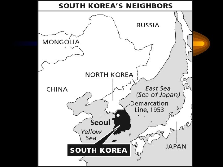 Geopolitics • In post-WWII, South Korea was separated from North Korea by the United States and the Soviet Union upon the surrender of Japan into two zones of temporary occupation, for the purpose of overseeing the orderly dismantling of Japanese rule and establishing a new Korean government. The United States was to occupy Korea south of the 38 th Parallel of latitude (a demarcation running east and west across the peninsula) while the Soviet Union was to occupy Korea north of that line.