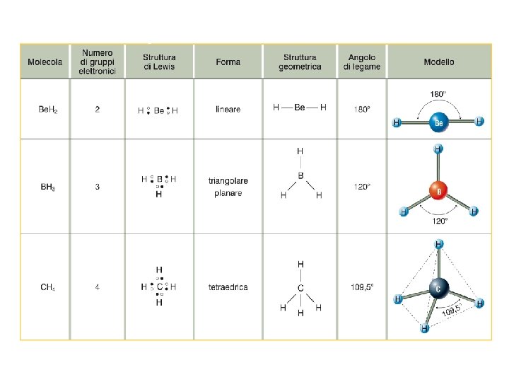 MOLECOLE CON TUTTE LE COPPIE ELETTRONICHE IMPEGNATE IN LEGAMI In base al numero di coppie elettroniche condivise intorno all’atomo centrale (ricavabili dalle formule di Lewis) si ha che: • due coppie individuano una geometria lineare con angoli di 180° • tre coppie determinano un assetto triangolare equilatero con angoli di 120° • quattro coppie individuano una geometria tetraedrica con angoli di 109, 5°