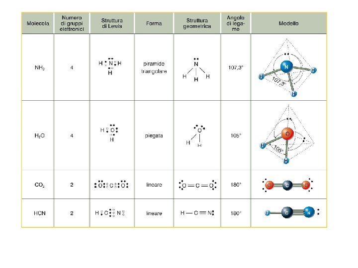 Molecola di NH 3: 4 coppie elettroniche di cui una libera La geometria di riferimento è quella tetraedrica. Tuttavia, a causa della maggiore repulsione esercitata dalla coppia di elettroni liberi, gli angoli di legame anziché essere di 109, 5° sono pari a circa 107, 3°. Inoltre, poiché la molecola presenta solo tre legami, la molecola non ha forma tetraedrica ma piramidale triangolare. Molecola di H 2 O: 4 coppie elettroniche di cui due libere La geometria di riferimento è quella tetraedrica. Per la presenza di due coppie elettroniche libere, l’angolo di legame diminuisce ulteriormente, è infatti di 104, 5°. Avendo solo due legami la molecola assume una forma detta piegata.