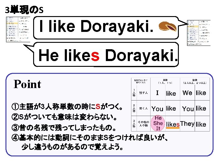 I like Dorayaki You like Dorayaki You like Slides: 44 Download presentation I like Dorayaki. You like Dorayaki. You like Dorami. Doramichan likes melonpan. I like Shizuka. You like Shizuka. She likes you. Gaian likes Gaiko. English is from England. I like dorayaki. You like dorayaki. Doraemon likes dorayaki. He likes dorayaki. We like dorayaki. They like dorayaki. Dorami likes melonpan. She likes melonpan. Doraemon loves dorayaki. He loves dorayaki. Doraemon wants dorayaki. He wants dorayaki. Doraemon eats dorayaki He eats dorayaki Shizuka likes sweet potatoes. She likes sweet potatoes. Gaian sings. He sings. Gaian cooks. He cooks. Suneo uses a computer. He uses a computer. Suneo drinks cola. He drinks cola. Dekisugi studies English. He studies English. Dekisugi runs. He runs. Shizuka plays the violin. She plays the violin. Nobita plays soccer. He plays soccer. Nobita plays baseball. He plays baseball. Nobita speaks English. He speaks English. Doraemon has a Time Machine. He has a Time Machine.