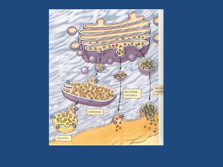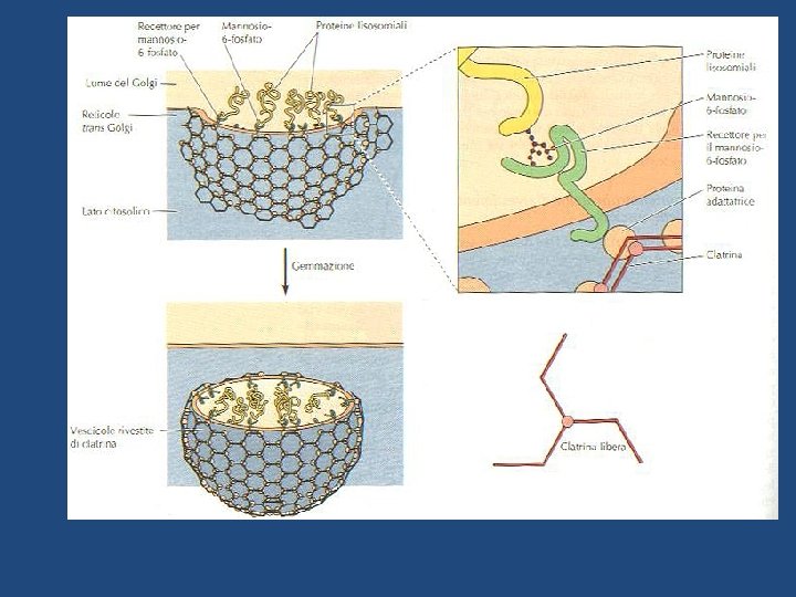 Le idrolasi lisosomiali e le proteine di membrana dei lisosomi sono sintetizzate nel RE ruvido e attraverso l’apparato del Golgi vengono trasportate agli endosomi tardivi (precursori dei lisosomi) da vescicole che gemmano dal porzione trans del Golgi. Esse portano un marcatore sotto forma di mannosio 6 -fosfato (M 6 P) che, riconosciuto da recettori di M 6 P transmembrana presenti nel trans Golgi, vengono impacchettate in vescicole rivestite di clatrina, successivamente liberate nell’endosoma tardivo.