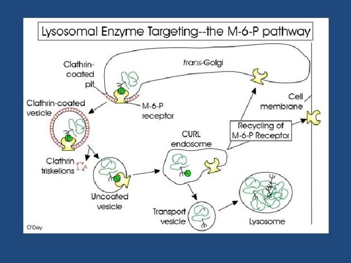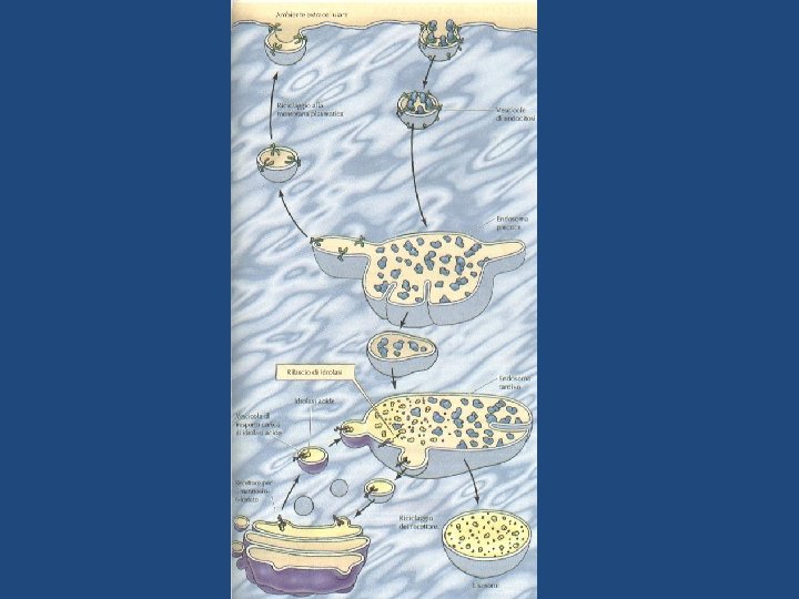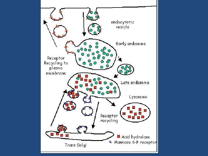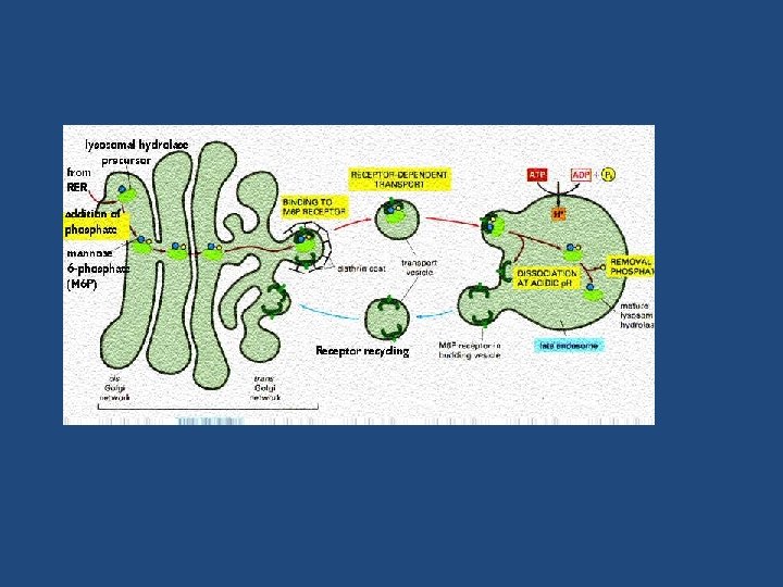Agli endosomi tardivi gradualmente giungono le idrolasi lisosomiali provenienti dal trans Golgi, le quali si dissociano dai recettori per l’M 6 P a causa del p. H acido (circa 6) degli endosomi. -La perdita del gruppo fosfato del mannosio determina l’attivazione delle idrolasi le quali cominciano a degradare il materiale endocitato porrato dagli endosomi precoci. I recettori per l’M 6 P, tornano mediante vescicole al trans Golgi