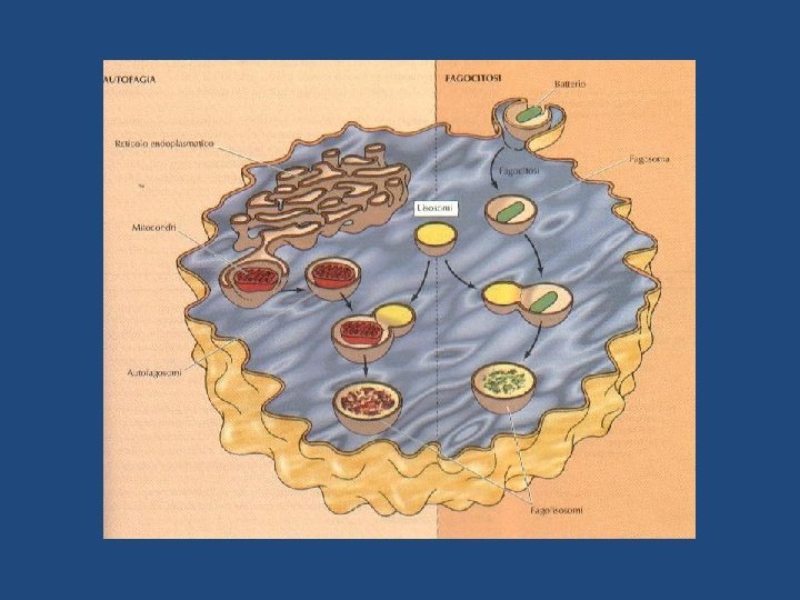 batterio fagosoma FAGOCITOSI endosoma precoce ENDOCITOSI reticolo endoplasmico endosoma tardivo LISOSOMI mitocondrio autofagosoma AUTOFAGIA