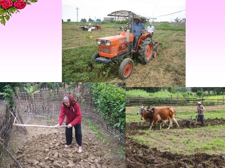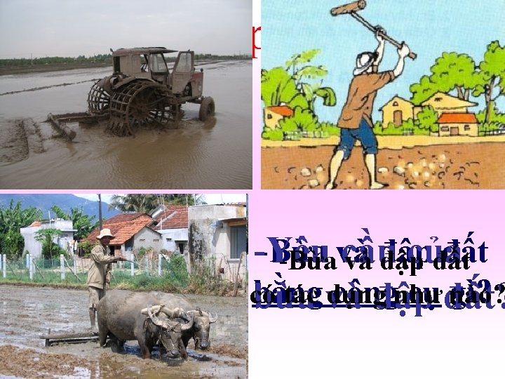Công cụ thủ công Công cụ cơ giới Thảo luận theo nhóm trong vòng 2 phút : “Hãy so -Giá thành -Làm nhanh, ít Ưu thấp, dụng cụ sánh ưu, nhược điểm của công tốn công… điểm đơn giản… cụ làm đất thủ công và cơ giới”. -Giá thành cao, Nhược điểm -Chậm, tốn nhiều công… dụng cụ máy móc phức tạp…