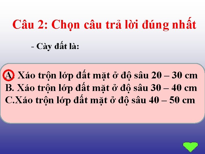 Câu 1: Làm đất có tác dụng: a. Làm cho đất tơi xốp, thoáng khí b. Diệt trừ mầm móng sâu bệnh, cải tạo đất. c. Làm cho đất tơi xốp bằng phẳng, diệt mầm mống sâu bệnh. d. Cả a , b