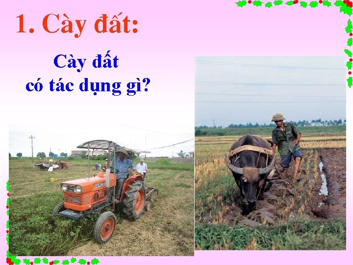 I. LÀM ĐẤT NHẰM MỤC ĐÍCH GÌ? Ruộng chưa được cày bừa Ruộng đã cày bừa Thảo luận theo cặp (2 phút) Ø Thửa ruộng chưa được cày bừa: Cỏ dại và sâu ? Hãy sát 2đất hình ảnhtơi trên và vận dụng những bệnh quan phát triển, không xốp. kiến thức đã được học nhận xét: Tình hình cỏ dại, Ø trạng Thửa ruộng được càytồn bừa: tại. Cỏtrên dại 2 không tình đất vàđãsâu bệnh thửa phát ruộng triển, sâu bệnh bị tiêu diệt, đất tơi xốp. đó ?