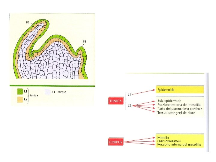 L 1 strato più esterno L 1 e L 2 : divisioni anticlinali L 3: piano di divisione meno orientato Tutti e tre gli strati hanno le proprie cellule iniziali e tutti e tre concorrono alla formazione del fusto e degli organi laterali