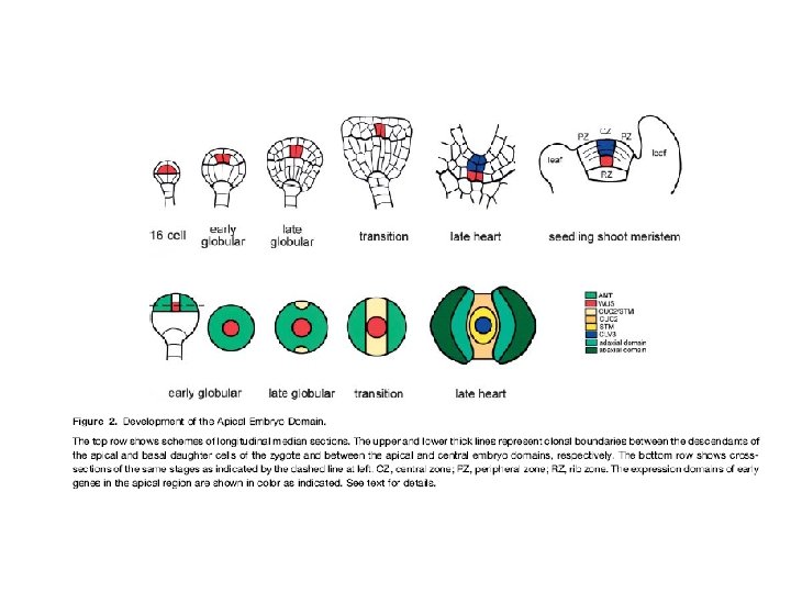 ØSi formano durante l’embriogenesi ØPiù corretto il termine protomeristemi ØIl protomeristema apicale è riconoscibile dallo stadio a cuore (le cellule interposte tra i cotiledoni si dividono in maniera orientata e si stratificano) ØProbabilmente l’identità di cellule meristematiche apicali è acquisita più precocemente (stadio globulare) ØLe iniziali della cuffia radicale si formano dall’ipofisi nello stadio a cuore,