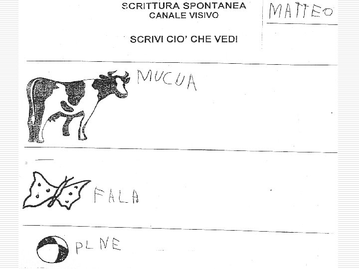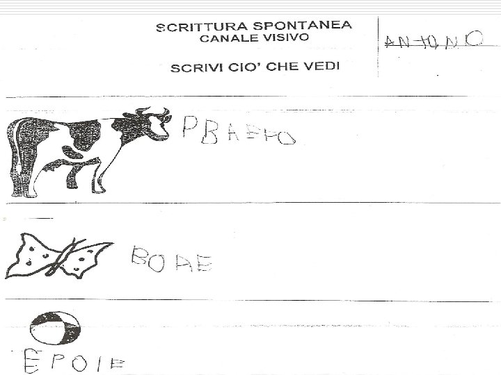 La ricerca di Ferreiro e Teberosky Evoluzione della scrittura: livelli di concettualizzazione Il bambino distingue il disegno dallo scritto Solo quando il modello di scrittura impiegato è lo stampato, ipotizza che i grafismi sono diversi e che varia o rimane costante la quantità 2. Ipotesi di quantità minima I potesi di varietà di grafismi 3. Il b, scopre che la scrittura rappresenta la lingua orale e che a parti dello scritto corrispondono parti del parlato: nasce l’ipotesi sillabica 4. L’ipotesi sillabica entra in conflitto e il b. fa l’ipotesi alfabetica oscillando per un periodo tra le due ipotesi 5. Il bambino scopre che ogni carattere della scrittura corrisponde a un valore sonoro minore della sillaba ed effettua un’analisi sistematica dei fonemi 6. Dovrà superare la barriera ortografica, ma ha capito il codice. 1.