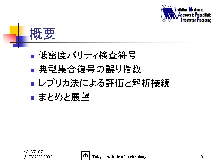 I n n Gallager 1962 4122002 SMAPIP 2002 Slides: 27 Download presentation 低密度パリティ検査符号(I) n n Gallager (1962) ランダムな疎パリティ行列に基づく符号 4/12/2002 @ SMAPIP 2002 Tokyo Institute of Technology 5 低密度パリティ検査符号(II) n 生成行列GT :K 4/12/2002 @ SMAPIP 2002 ビット→N ビット Tokyo Institute of Technology 符号化率 6 平均誤り確率の誤り指数 n 誤り確率のアンサンブル平均 n 誤り指数 4/12/2002 @ SMAPIP 2002 Tokyo Institute of Technology 14 結果(k, j→∞のとき) n 誤り指数 4/12/2002 @ SMAPIP 2002 Tokyo Institute of Technology 24 結果(有限のk, j ) n 誤り指数 n 情報理論の下限と赤い部分で一致 4/12/2002 @ SMAPIP 2002 Tokyo Institute of Technology 26