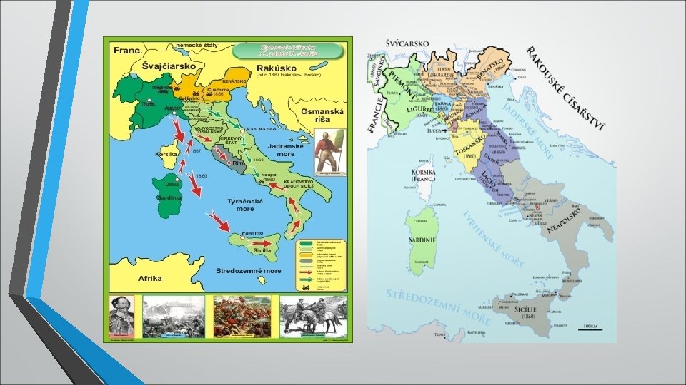 - vojna s Rakúskom: - 1859 bitka pri Magente a pri Solferine, Sardínia s francúzskou pomocou vyhrala - Rakúšania stratili Lombardiu - G. Garibaldi využil situáciu a obsadil aj Neapolsko