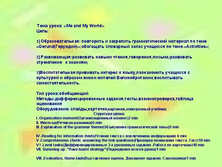 VII. Summing up «Нave learnt» strategy Students have practiced the usage of Gerund. They were introduced with the culture of Great Britain and British way of life. During the lesson we were developing, speaking , reading, listening and writing skills I think that students are interested in learning English VIII. Evaluation, home task: writing a composition «My hobby»