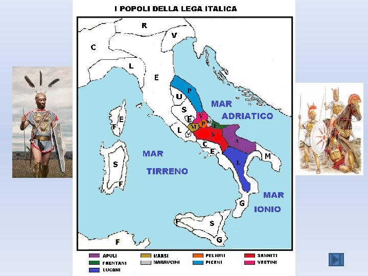 I PELIGNI Il loro territorio era diviso in tre parti, dominate dalle tre città di Corfinium (Corfinio), Sulmo (Sulmona), e Superaequum (Castelvecchio Subequo), parlavano un dialetto sabellico ed erano devoti ad Ercole Curino. Divennero socii romani nel 304 a. C: Nel 91 a. C. , Corfinium fu scelta come capitale della «Lega Italica» e ribattezzata «ITALIA» . In una delle monete che vi si coniarono compare, nel diritto, una testa femminile coronata d’alloro e la scritta «ITALIA» e, nel rovescio, il giuramento di fedeltà dei capi italici, svoltosi a Corfinium restò capitale fino al 30 aprile dell’ 89 a. C. , quando fu occupata dalle legioni di Cneo Pompeo Strabone. Al termine della Guerra Sociale, durante la quale furono guidati da Publio Presenteio, anche ai Peligni fu riconosciuta la cittadinanza e furono assegnati, insieme ai Marsi, alla tribù Sergia.