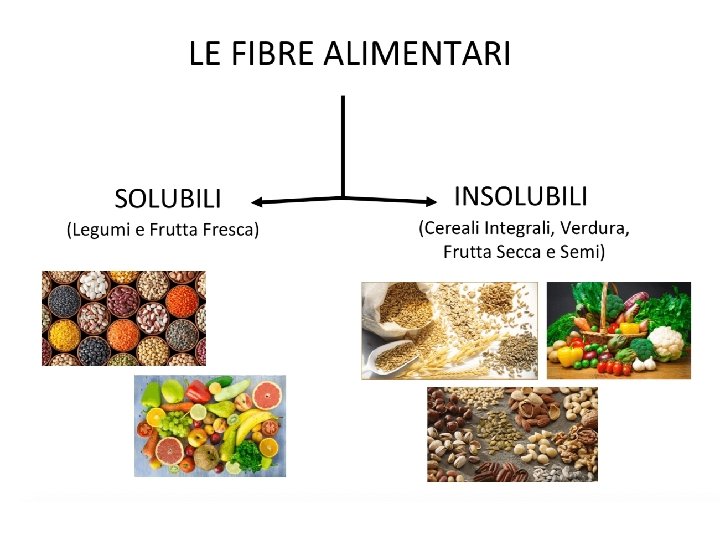 Le fibre insolubili Quando si trova nell'intestino, la fibra alimentare insolubile assorbe acqua, il che ha l'effetto di: • aumentare il volume delle feci e rendere quest'ultime più morbide; • velocizzare il transito intestinale, riducendo il tempo di permanenza nell'intestino delle sostanze tossiche per la mucosa intestinale. Le principali fonti di fibra insolubile sono: i cereali integrali, le verdure a foglie verde, le zucchine, i semi di lino e la frutta secca.