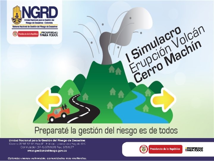 OBJETIVO Fortalecer la capacidad del SNGRD ante un posible erupción del volcán cerro Machín en el departamento de Tolima, a través de la recreación de escenarios de respuesta, instalación de salas de crisis, evacuación de los habitantes en zona de riesgo y activación de planes de continuidad de las administraciones municipales.