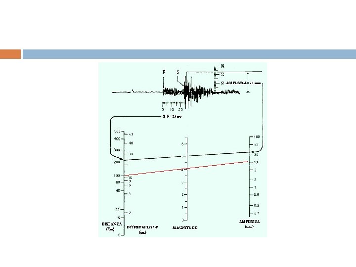 Scala Richter La scala Richter misura invece la Magnitudo, ossia l’energia effettivamente liberata dall’ipocentro di un terremoto. È basata sull’ampiezza massima delle onde sismiche misurate da un sismografo a 100 Km dall’epicentro (A). La scala Richter è inoltre una scala “aperta”, ossia non ha limiti le inferiori ne superiori. È inoltre una scala logaritmica (M = Log 10 A/A 0)