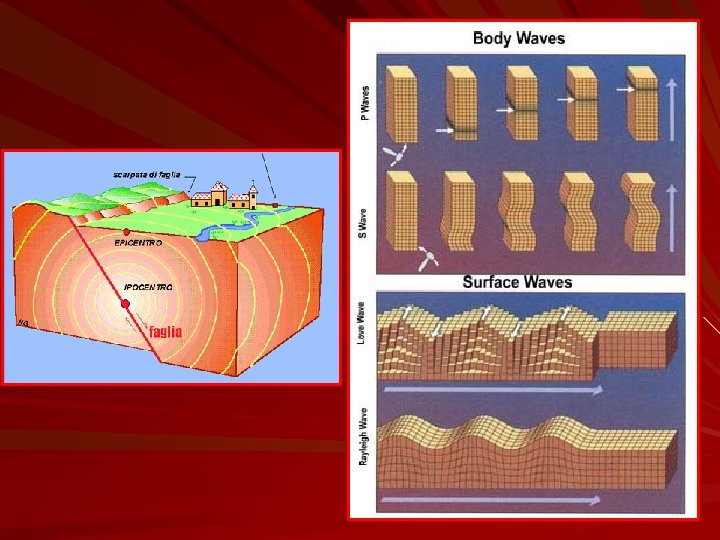 ONDE P ONDE S ONDE L Onde elastiche generate nei terremoti. Provocano una deformazione dinamica dei materiali attraversati. Si propagano secondo i principi del moto ondulatorio