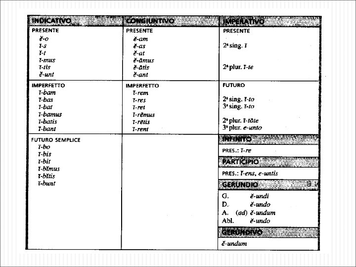 Note Il verbo ha coniugazione regolare nel sistema del perfetto Ammette forme di impersonale passivo: Itur, “si va” Ibatur, “si andava” Ibitur, “si andrà” Itum est, “si andò” …